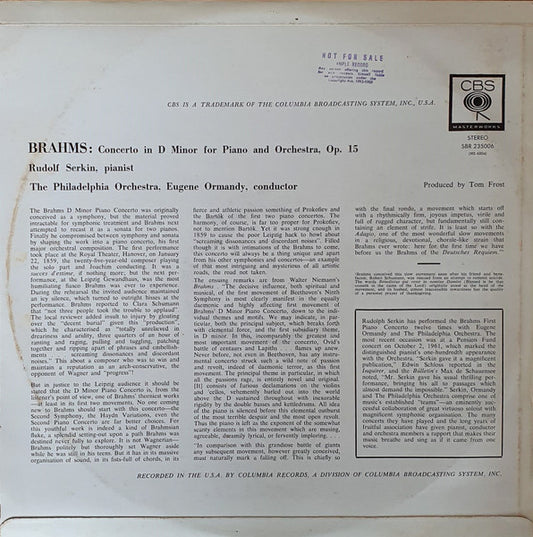 Rudolf Serkin / Eugene Ormandy, The Philadelphia Orchestra / Johannes Brahms - Piano Concerto No.1 In D Minor (LP, Album) (Very Good Plus (VG+))