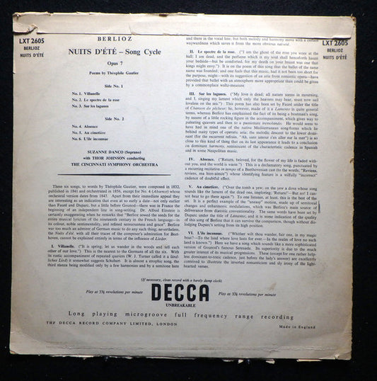 Suzanne Danco / Thor Martin Johnson, Cincinnati Symphony Orchestra - Berlioz Nuits D'Été - Song Cycle Opus 7 Poems By Théophile Gautier (LP, Mono) (Very Good Plus (VG+))