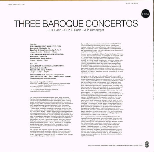 Johann Christian Bach - Carl Philipp Emanuel Bach - Johann Philipp Kirnberger - Three Baroque Concertos (LP, Album, Club) (Very Good Plus (VG+))