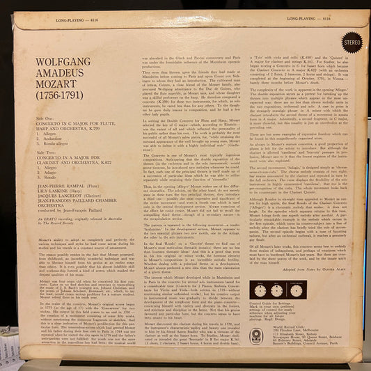 Mozart* / Jacques Lancelot (Clarinet) / Lily Laskine (Harp) / Jean-Pierre Rampal (Flute) / Jean-Francois Paillard Chamber Orchestra* - Clarinet Concerto (K. 622) / Flute & Harp Concerto (K.299) (LP, Album, Club, RE) (Very Good Plus (VG+))