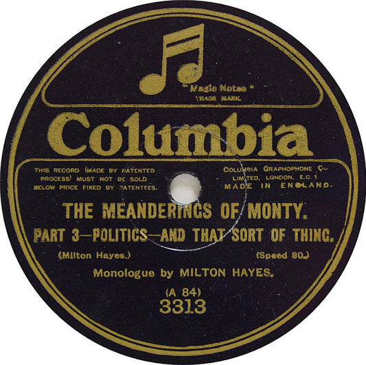 John Milton Hayes - The Meanderings Of Monty, Part 3 - Politics - And That Sort Of Thing / You Know What I Mean (Shellac, 10", 80 RPM) (Very Good Plus (VG+))