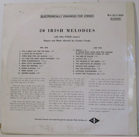 John O'Neill , Gordon Franks Singers And Music - 20 Irish Melodies (LP, Album) (Very Good Plus (VG+))