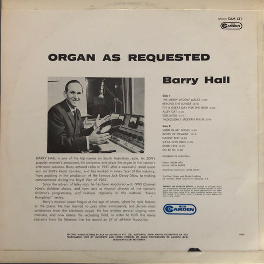 Barry Hall - Organ As Requested (LP, Album, Mono) (Very Good Plus (VG+))