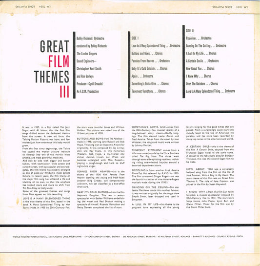 Bobby Richards' Orchestra Great Film Themes III Vinyl Album LP 1962 Pressing