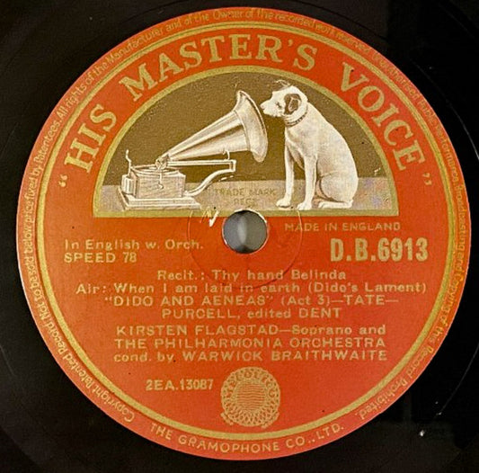 Kirsten Flagstad And Philharmonia Orchestra, Walter Susskind, Warwick Braithwaite - Che Fano Senza Euridice / When I Am Laid In Earth (Shellac, 12") (Very Good Plus (VG+))