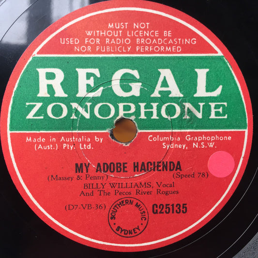 Billy Williams And The Pecos River Rogues - Across The Purple Sage / My Adobe Hacienda (Shellac, 10") (Very Good (VG))