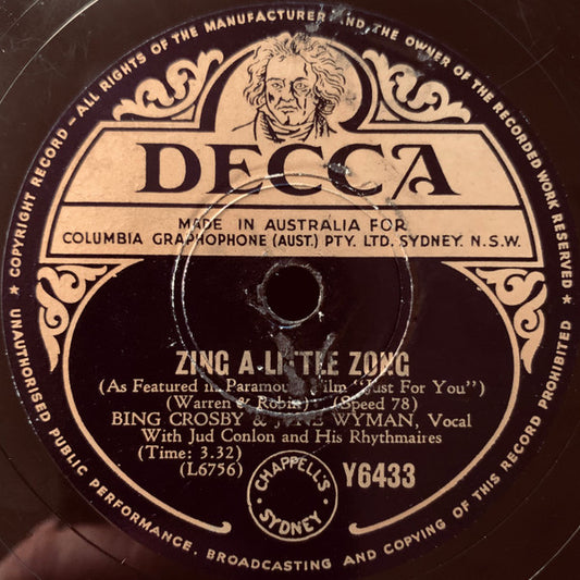 Bing Crosby & Ben Lessy / Bing Crosby & Jane Wyman - On The 10.10 From Ten-Ten-Tennessee / Zing A Little Zong (Shellac, 10") (Very Good Plus (VG+))