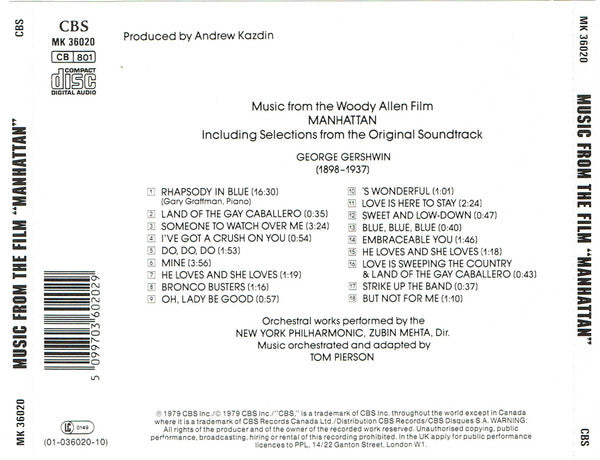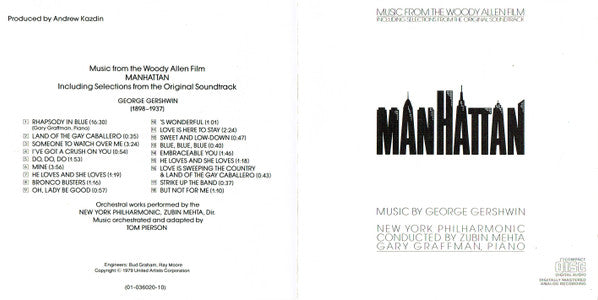 George Gershwin - New York Philharmonic Conducted By Zubin Mehta With Gary Graffman - Music From The Woody Allen Film "Manhattan" (CD, Album) (Very Good Plus (VG+))