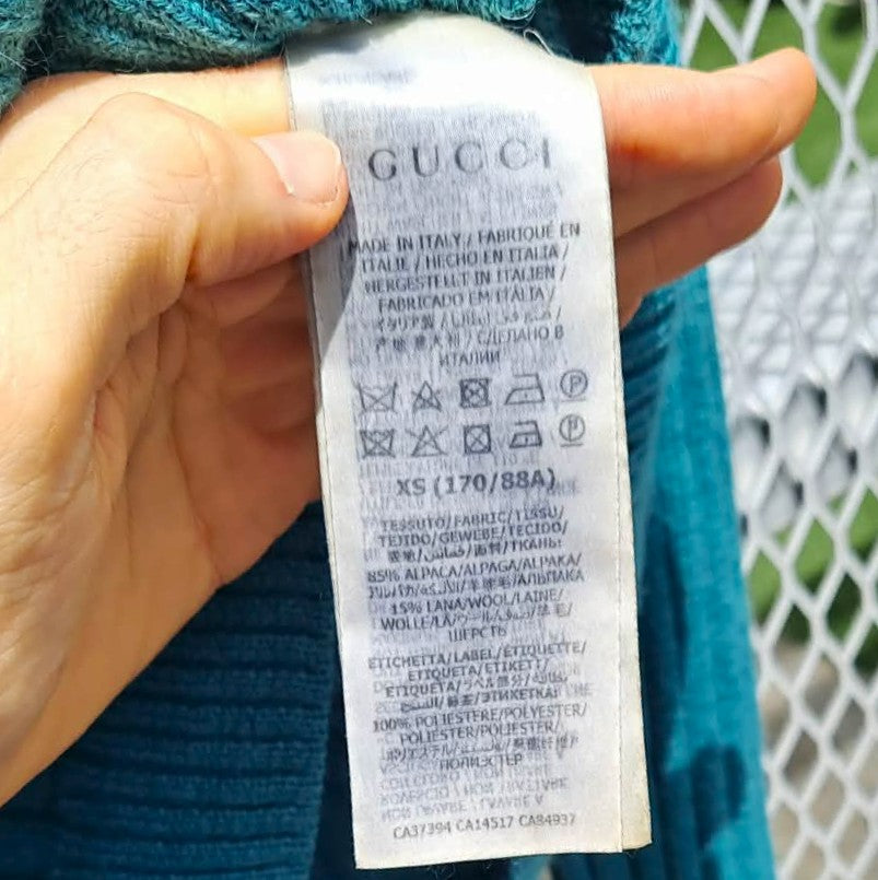 A classic Gucci men’s knit from the Michele era, crafted in rich wool with a clean roll‑neck silhouette. Fine Italian craftsmanship deserving of the term luxury. This style reflects the iconoclastic 2019–2021 Gucci knitwear direction: bold teal (blue-green) color, thick Alpaca-blend wool construction, and subtle archival flair. Features the standard Gucci CA‑series ready‑to‑wear coding used across authentic knitwear of this period.