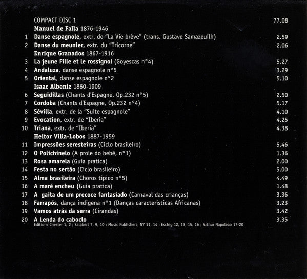 Recordings: Paris, Salle Wagram 6, 10, 11.V.1960 (1-1 to 1-14); Rio de Janeiro, 29.VII,1972 (1-15 to 1-20), Paris, Théâtre des Chapmps-Elysées, 9-10.VI.1954 (2-1); Paris, Schola Cantorum, 14-19.VI, 1951 (2-2 to 2-10). Recorded By: Ducretet-Thomson (2-2 to 2-9). Total time: 77:11 (CD1), 76:29 (CD2) Published by: Chester (1-1, 1-2), Salabert (1-7, -19, 1-10); Music Publishers NY (1-11, 1-14); Eschig (1-12, 1-13, 1-15, 1-16, 2-1); Arthur Napoleao (1-17 to 1-20). ℗ 1953-1972 EMI Music France & EMI Brésil (1-15 to 1-20) This compilation and digital remastering ℗ 1996 EMI Music France Made in the EU.