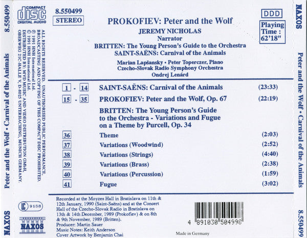 Prokofiev*, Saint-Saëns*, Britten*, Jeremy Nicholas, Marian Lapšansky*, Czecho-Slovak Radio Symphony Orchestra*, Ondrej Lenárd, Peter Toperczer - Peter And The Wolf / The Young Person's Guide To The Orchestra / Carnival Of The Animals (CD) (Very Good (