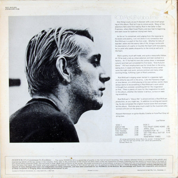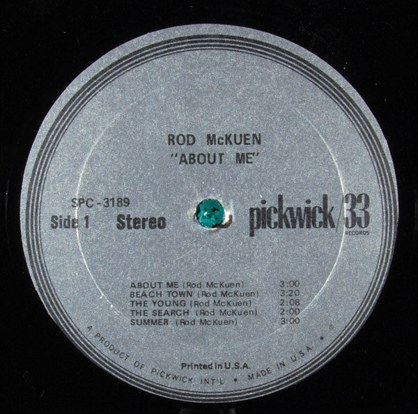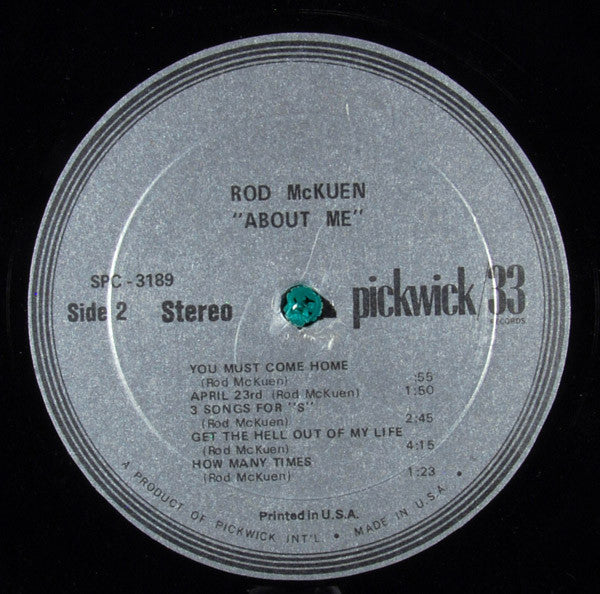 All songs published by Arvee Music Co. except: "3 Songs for S" and "Get The Hell Out Of My Life" which are published by Centaur Music Co. From the description on the back of the album sleeve: "Rod McKuen's 'About Me' is almost entirely a Rod McKuen production, as you might say. In addition to writing and recording, he also composed the original musical score that accompanies this album. Rod also gives much credit to the musicians who worked with him on the sessions."
