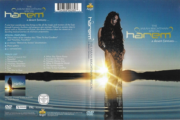 Main movie begins with an uncredited intro with 1:30 duration. Headings and durations extracted from dvd video and dvd menu. Credits extracted from dvd video. This detailed information is not mentioned on the cover artwork. Full title on cover artwork: "Harem - The Sarah Brightman Special - A Desert Fantasy..." A one-hour soundscape that brings to life all the magic and mystery of the East through hypnotic rhythms and gorgeous epic settings. Filmed at ancient sites in places such as Morocco and Egypt, this desert fantasy takes the viewer on a dazzling journey of cinematic proportions. Special Features: - New videos of her timeless hits "Time To Say Goodbye" and "Anytime, Anywhere" - 30-minute "Behind the Scenes" documentary - Photo gallery - 5.1 surround mix Printed in the EU ℗ & © 2003 Angel Records. This label copy information is the subject of copy- right protection. All rights reserved. © 2003 Angel Records. www.angelrecords.com PM 912 Logos for: DVD VIDEO PAL 5.1 PRODUCTION SERVICES E | EXEMPT FROM CLASSIFICATION FSK (German Youth Control)