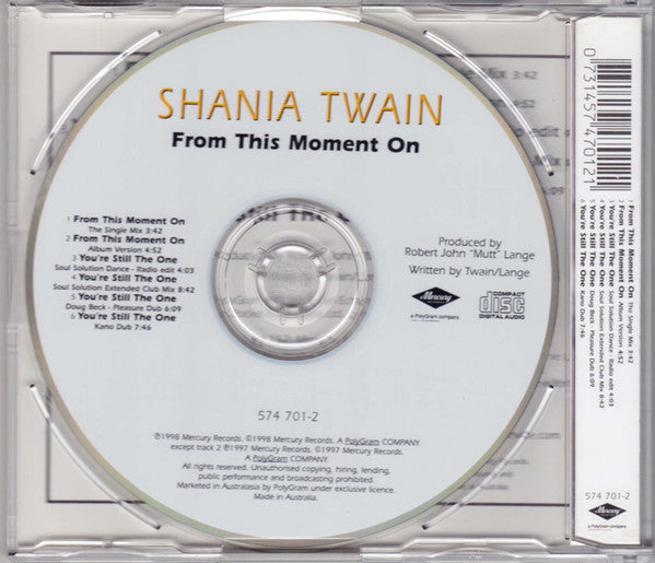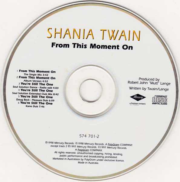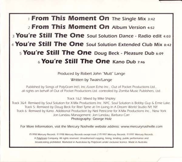 Published by Songs of PolyGram Int'l, Inc. / Loon Echo Inc. / Out of Pocket Productions Ltd., all rights on behalf of Out of Pocket Productions Ltd. controlled by Zomba Music Publishers, Ltd. Tracks 3 and 4 remixed for X-Mix Productions Inc. NYC. Track 5 remixed for Reel Tyme at I'm Living In A Dream World Studio NY, NY. Track 6 additional production for X-Mix Productions Inc., New York ℗ 1998 Mercury Records. © 1998 Mercury Records except track 2 ℗ 1997 Mercury Records. © 1997 Mercury Records. A PolyGram Company. Marketed in Australasia by PolyGram under exclusive licence. Made in Australia. Stickered ('Includes previously unavailable DANCE MIXES of "YOU'RE STILL THE ONE" 5747012') and housed in a slimline plastic jewel case. Not all copies had this sticker. Track 2 length incorrectly specified as 4:52 on packaging.